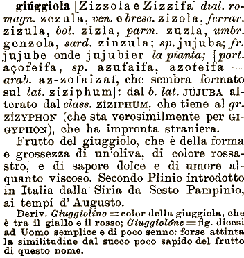 Gri&YPHON), che ha impronta straniera. Frutto del giuggiolo, che da Sesto Pampinio, ai tempi d' Augusto. Deriv. Giuggiolino ==. color della giuggiola, che è tra il giallo e il rosso; Giuggiolene ==fig. dicesi ad Uomo semplice e di poco Siria ferrar è della forma e grossezza di un'oliva, di colore rossastro, e di sapore dolce e di umore alquanto viscoso. Secondo Plinio introdotte in Italia dalla zizula, boi. zizia, parm. giuggiola [Zizzola e Zizzifa] dial. romagn. zezula, ven. ebresc. ZÌZOÌ o,, zuzia, umbr genzola, sard. zinzula; ^?.jujuba;/r, jujube onde jujubier la pianta; [pori acofeifa, sp. azufaifa, azofeita == arab. az-zofaizaf, che sembra formate sul lai. ziziphumj: dal b. lai. JÙJUBA alterato dal class. ZÌZIPHUM, che tiene al gr, ZIZYPHON (che sta verosimiJ mente per senno: forse attinta la similitudine dal succo poco sapido del frutte di questo nome.