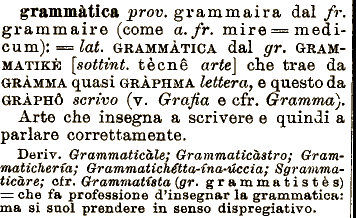 scrivo (v. Grafia e cfr. Grammo). Arte che insegna a scrivere e quindi a parlare Grammaticąstrof grammątica prov. grammaira dal fr. grammaire (come a.fr. mire=== medicum): == tat. GRAMMĄTICA dal gr. GRAMMATIKČ [sottmt. tčcnč arte] che trae da GRĄMMA quasi GRĄPHMA lettera, Grammaticheria; Grammatichétta-'Cna-'uccia; Sgrammaticare; cfr. Grammatista {gr. grammatistčs) ==. che fa professione d'insegnar e questo da GRĄPHŅ correttamente. Deriv. Grammaticale^ la grammatica: ma si suoi prendere in senso dispregiativo.