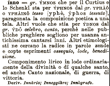 yphos tessuto], paragonata la composizione poetica a una tela. Altri vuole che stia per YDNOS dal gr. YDÓ celebro, canto, perché nelle pubbliche preghiere Inno == gr. YMNOS che per il Curtius e lo Schenld sta per sogliono per usanza benedizione, Componimento lirico in lode ordinariamente della divinità o di qualche santo, ed anche Canto nazionale, di guerra, di vittoria. Deriv. Innàrio; Inneggiare; YPHNOS dal gr. YPHÀÓ o YPHÀINÓ tesso [yphè, antichissima cantarsi inni. Altri etimologisti ne cercano la radice in parole zende e copte esprimenti ossequio, lode, Innografo.