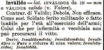non e VĀLIDUS valido (v. Valere). Contrai*, di Valido ; Debole, Non efficace. Come ==== lat. INVĀLIDUS da IN == sosh. Soldato ferito militando o fatto inabile per l'etā al? esercizio del? armi; Colui che per infermitā o vecchiaia non puō procurarsi il vitto. Deriv. Invalidamente; Invalidaménto; Invalidare ==. Fare o ridurre di mun valore; Invalidazione; invālido Invaliditā.