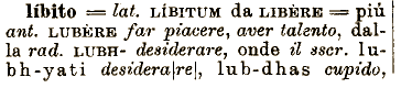 fed liop, worf. lieb, ani. slav. Ijubu, boem liby) caro, amato^ a. a. ted. liuban == a. mod. lieben amare, 16bhas cupidità, got. liubs (== a. lob lode lobón sa mod. lo ben lodare, ani. si. Ij ubiti amare Ijub-imi di sua volontà, ^.liùbyti aveì voglia, boem. libiti aver di buon grado gr. liptein appetire, desiderare (cfr. Libidine, Libero). Piacere, Piacimento, Voglia, Capriccio e adoprasi nella frase « a libito » [== lai. AD LIBITUM] che vale Quando come pare e piace.