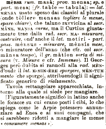apparecchiata, intorno alla quale si siede per mangiare. [Figuratamente significò in latino anche le focacce su cui erano posti i cibi, lo che spiega come attribuendogli il significato le Arpie potessero annunziare ad Enea e ai suoi compagni, che si sarebbero ridotti a mangiare le mense consumerò mènsa rum. masà; prov. mensa; ^p. e pori. mesa; [fr. table == tabula]: === Ja. MÈNSA usato spesso dai classici al plurale (onde tollero mensas togliere le mense, sparecchiare), che taluno ravvicina al sscr. MANS, MANSA carne, ma il Curtius giustamente trae e cfr. Immenso). Il Georges però dubita si rannodi alla rad. MÈN" d'onde il lai. B-MIN-ÈRB sporgere, MÈN-TOM mento [che sporge], generico di rialzamento. Tavola rettangolare dalla rad. sscr, MA- misurare, costruire, ond'anche il lai m e tir i " pari. pass. mènsus • misurare, mènsis mese, o misuratore dell'anno (che cfr. col sscr. m ansa tempo), il gr. m a fio n sorta di misura (v. Misura mensas »].