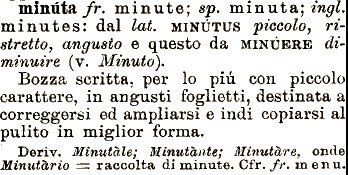 indi copiarsi al pulito in miglior forma. Deriv. Minutale; Minutante; Minutare, scritta, per lo più con piccolo carattere, in angusti foglietti, destinata a correggersi ed ampliarsi e onde milróta/r. minute; sp. minuta; zngl. minutes: dal lat, MINÙTUS piccolo, ristretto, angusto e questo da MINÙBRE diminuire (v. Minuto). Bozza Minutàrio == raccolta di minute. Cfr. fr. menu.