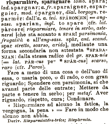modo che alcuno non abbia. Deriv. Risparmiatdre'trfce; risparmiare, sparagnare como. spara; lad. spargnar; a. fr. sparai gner,espargnier, mod. épargner, dial. che avanzi parte delle entrate ; Mettere da parte e tenere in serbo; per metaf. Aver riguardo, rispetto, cura; Condonare. « Risparmiare ad alcuno la fatica, la in borgogn. reparmèr: dalPa. a. ted. SPARON|EN| •== angsass. sparian, ingl. fco spare [cfr. lai. pàrcere| risparmiare, tenere in serbo, astenersi [che sta accanto a SPARÌ parsimonia, frugalità e &[Vang-sass. vergogna, la pena » === Fare non attestata *SPAEANJAN : dalla stessa radice del gr. SPAR-HOS [s== lai. PÀR-CIA5 pe^ * SPÀR-c^s] scarso, raro (cfr. Parco). Fare a meno di una cosa o dell'uso di essa, o usarla poco, o di rado, o con gran riguardo; Spendere con parsimonia, si spàr, ant. scand. spar stretto, scarso, arido}, mediante una forma secondaria .Rispàrmio.