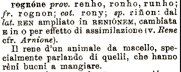 sp. rifion: dal lai. REN ampliato rognóne prov, renho, ronho.runho; /r. rognon; cai. rony; in RRNIÒNEM, cambiata E in o per effetto di assimilazione (v. Itene cfr. Arnione). Il rene d^un animale da macello, specialmente parlando di quelli, che hanno rèni buoni a mangiare.
