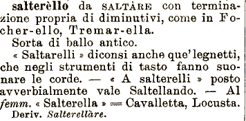 in Pocher-ello, Sorta di ballo antico. Saltarelli » diconsi anche que^legnetti, che negli strumenti di tasto fanno suonare le corde. — A salterelli » posto avverbialmente vale Saltellando. — Al femm. « Salterella » == Cavalletta, Locusta. Dériv. Salterellare. Tremar-ella. salterèllo da SALTARE con terminazione propria di diminutivi, come