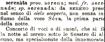 serena, med. fr. sere nade; sp. serenada: da SKRÉNO prese nel senso serenata prov. di ciclo scoperto^ non senza in flusso della voce Séra. la prima part( della notte. Concerto di voci o di suoni, che si -! la notte al sereno sotto le finestre di ai cuno, ma specialmente della innamorata