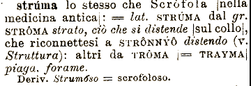 che si distende (sul collo,!, che riconnettesi a STRÒNNYÒ distendo (v. Struttura): altri da TRÒMA |== TRAYMA] piaga, forame. Deriv. ' strùma lo stesso che Scròfola [nella medicina antica!: === lai. STRÙMA dal gr. STRÒMA strato, ciò Strumffso == scrofoloso.
